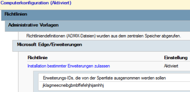 Zur zentralen Steuerung von Microsoft Edge Erweiterungen über Gruppenrichtlinien kann die App-ID einer Erweiterung in eine Zulassungsliste aufgenommen werden. Dies erfolgt über die Konfiguration eines Gruppenrichtlinienobjekts (GPO) auf Domänenebene.
